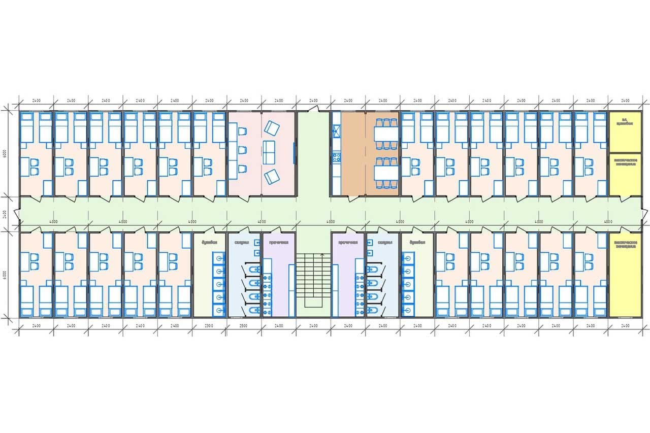 Главная страница » Продукция » Модульное общежитие 622 м2 МО-5-622